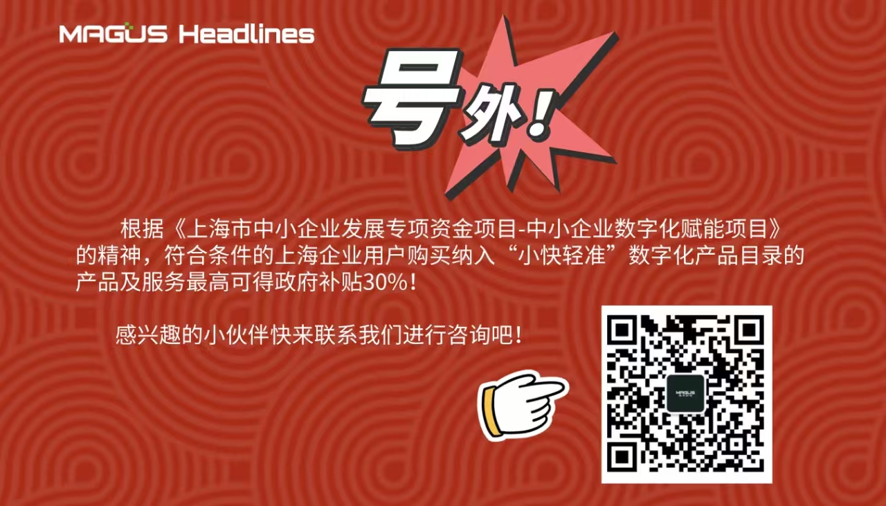 更大的喜讯是,根据《上海市中小企业发展专项资金项目-中小企业数字化赋能项目》的精神,符合条件的上海企业用户购买纳入“小快轻准”数字化产品目录的产品及服务最高可得政府补贴30%!感兴趣的小伙伴快来联系我们进行咨询吧!